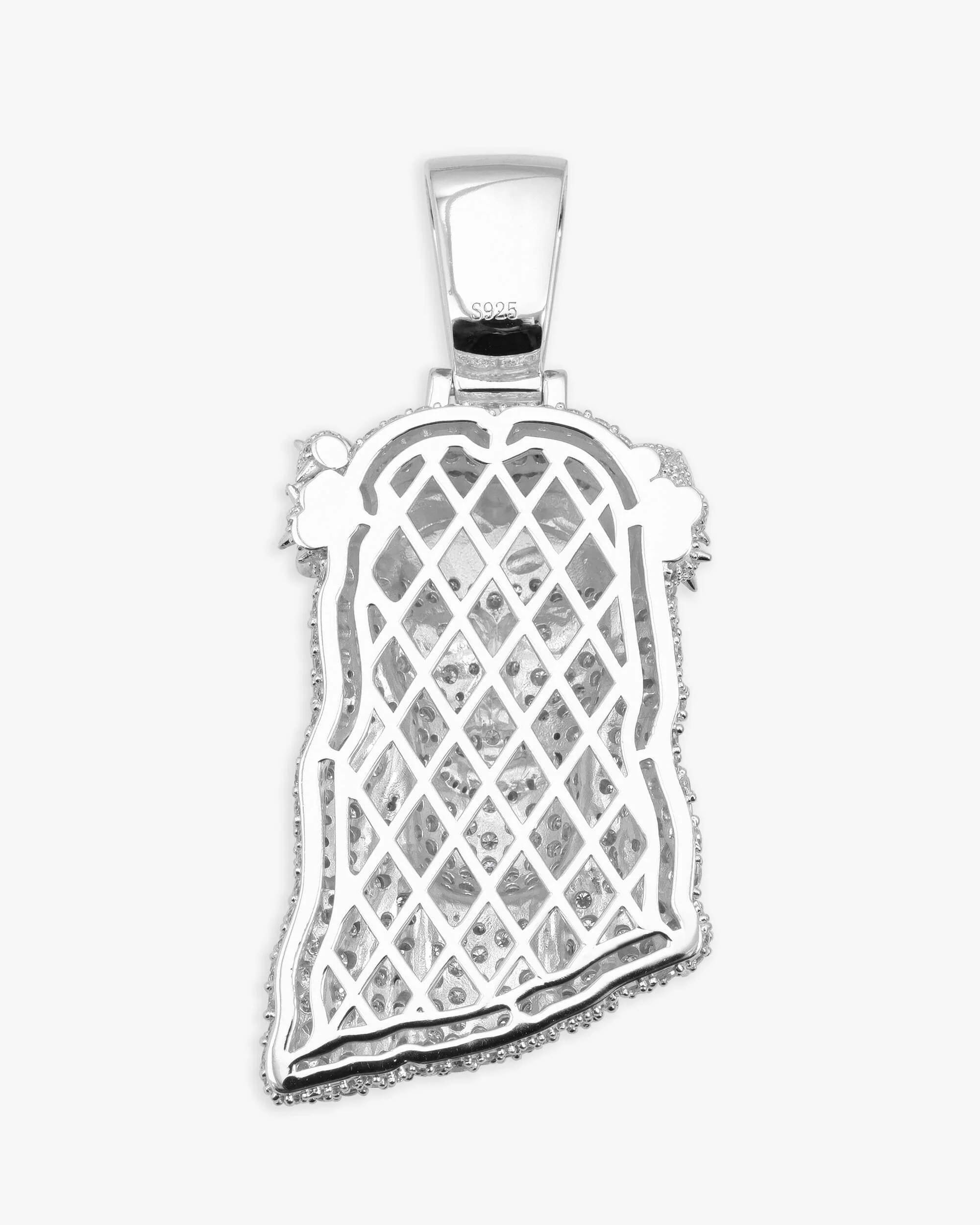 This moissanite pendant is iced out with round cut, colorless (D-Color), VVS moissanite flawless diamonds. All of the diamonds on this moissanite pendant are guaranteed to pass the diamond tester.